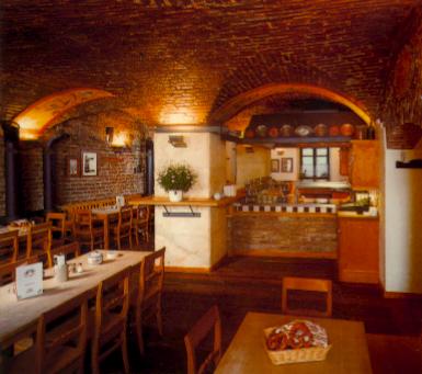 Der rechte Gastraum besteht aus einem bezaubernden 350 Jahre alten Backsteingewölbe, einer Mischung aus Kreuz- und Böhmischem Gewölbe. Hier werden täglich am offenen Buchenholzfeuer Rostbratwürstchen gegrillt.. | ![]() |